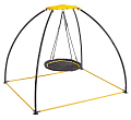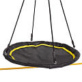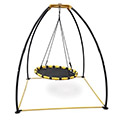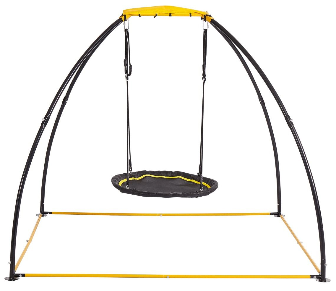Top-selling JumpKing SwingThis is latest VERSION 4 model of this legendary robust swing! Designed to match the JumpKing trampoline range, the UFO garden swing has gained a very good reputation owing to its sturdy yet attractive shape, and is loved by children. The swing is quick and easy to assemble, ensuring kids can be playing alongside their friends and family in no time. The poles are black powder-coated steel, forming a strong weather-resistant structure. The UFO swing can move in all directions, a 360 degree swing. The seat material is made of permatron, the same base as a trampoline, it is very comfortable to sit/lie on and can hold more than one child, up to a weight limit of 90kg. You can also put your own cover over the top to provide some shade, or convert it instantly into an exciting den. The swing comes with metal pegs if you want to anchor it to the grass and expandable screws if you'd prefer to fix it down onto a patio. - Strong black powder-coated steel frame